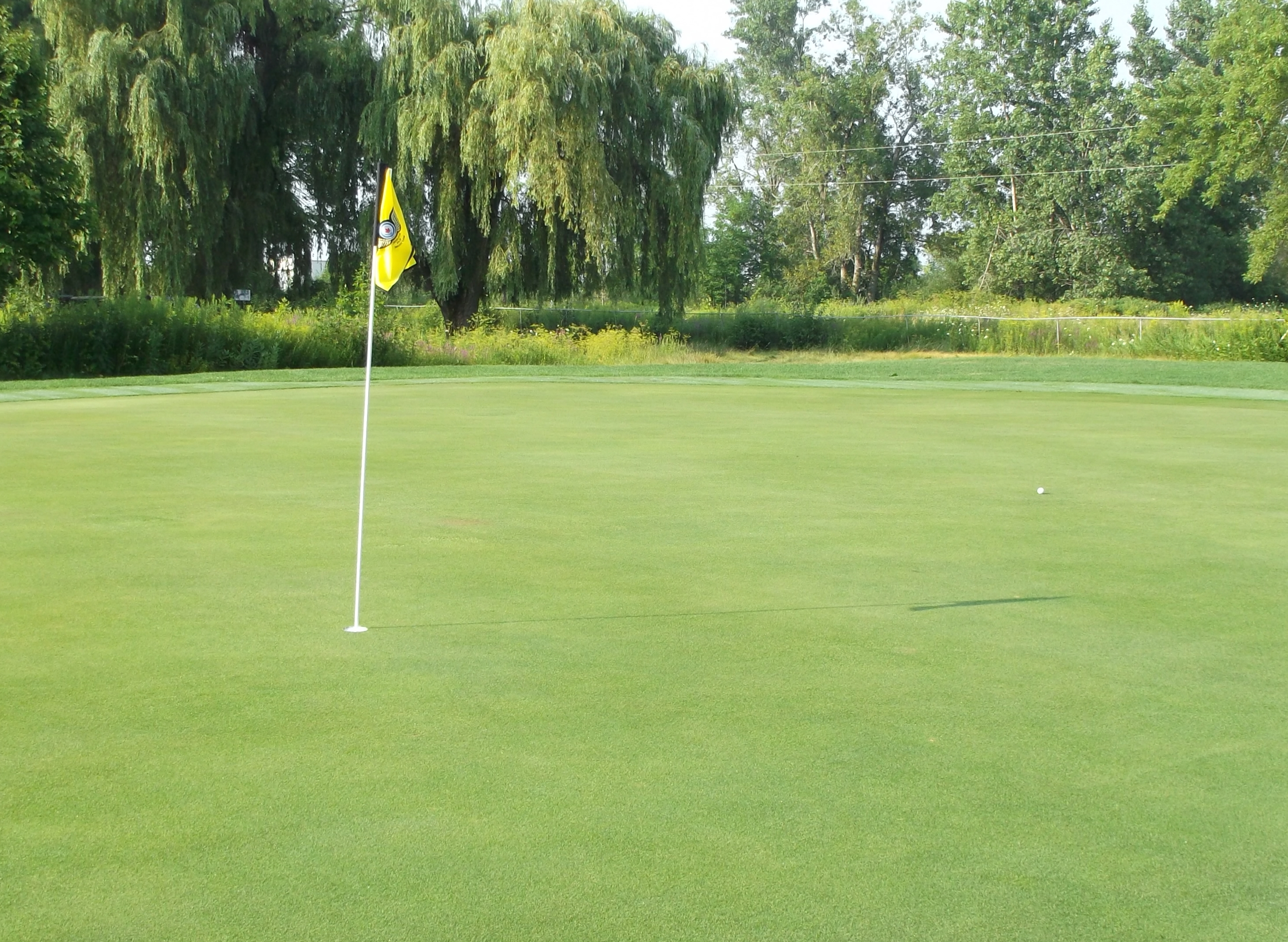 But, that is exactly what happened! My ball bounced off the post and rolled directly behind the pin. You can see the ball sticking out just above the bottom of the pin! The above picture was taken from the far left post described above. I kid you not; now I am putting for eagle to go 1 under for the front nine!