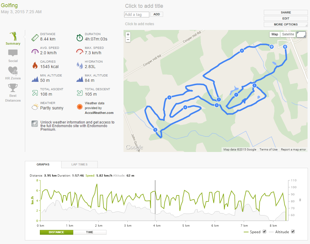 As you can see from above, it took me just over 4 hours to the walk 18 holes or 8.44km. I played the whites so the course length was right around 6,000 yards.