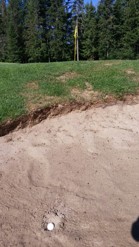 During the same round with Geary, I hit my 8-iron short into the sand trap on the 14th hole. I am not sure why, but my shot ballooned and landed in the sand. As you can see, my next shot was from an embedded lie.