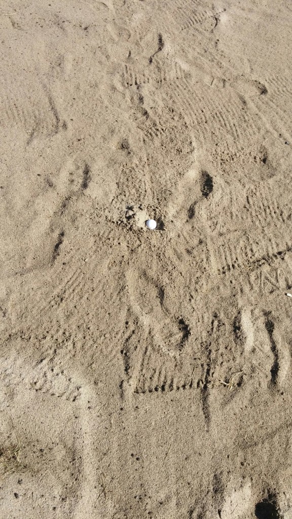 An embedded lie in the sand trap. More importantly, notice all the rake and foot print marks around my ball! I appreciate everyone looking after the golf course!