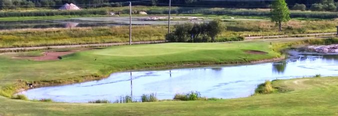 Because the ground was so wet and spongy, my ball came to rest outside the hazard just off the front of the green. My ball skipped over the water just to the right of the picture and ended up with a decent shot for my up and down. Using my new Titleist Vokey sand wedge, I easily saved par.