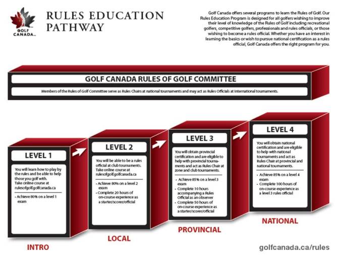 “Golf Canada offers several programs to learn the Rules of Golf. Our Education Program is designed for all golfers wishing to improve their level of knowledge of the Rules of Golf including recreational golfers, competitive golfers, professionals and rules officials, or those wishing to become a rules official.” (Golf Canada)