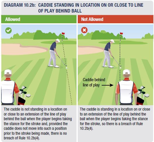 • The player’s caddie must not deliberately stand in a location on or close to an extension of the line of play behind the ball for any reason.
