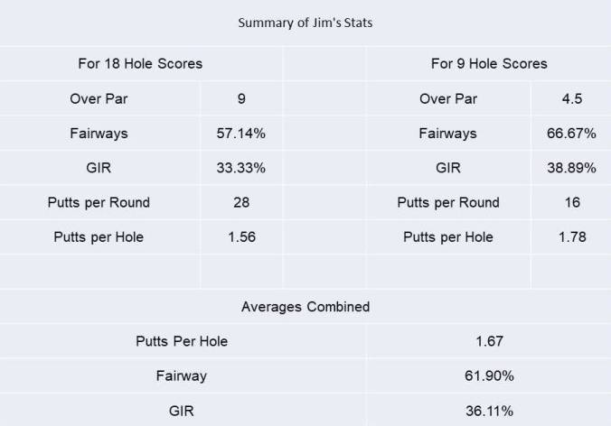 Jim, looks good. You are only measuring what you can use. I track GIR, putts per round, total score, and relation to par. First round in a month is scheduled for Saturday in Pennsylvania. I’m back and I’m pumped!