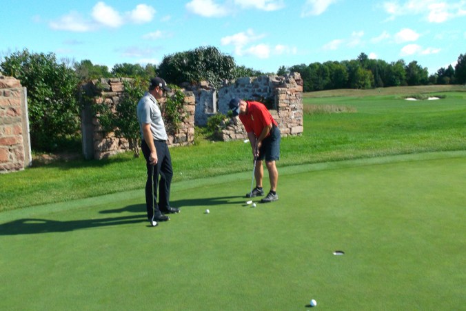 I was fortunate to have Drew Evans provide some putting tips. As he watched me putt, he indicated that I had a very good putting stroke. He emphasized the importance of keeping my triangle while putting. When I asked about my view of following through twice as far as the back swing, he indicated that it was a good drill for mid to high handicap players, but for lower handicappers, a smoother even putting stroke is preferred. Lastly, he suggested that I move my hands out from my body about 2 inches to keep my shoulders, wrists and putter head in a straight line…man did that make a positive difference! Thanks Drew I appreciate the help.