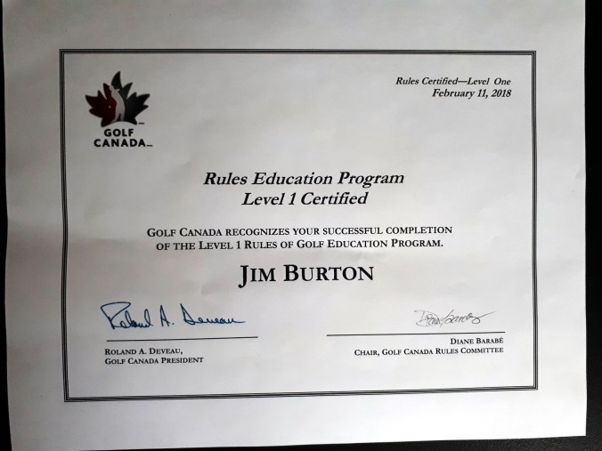 First the background information that will set the stage for my next move. As you are all aware, in February 2018, I successfully passed the Level 1 Rules Course from Golf Canada. I believe it was a good achievement and felt (still do actually) that it helped my golf game. Understanding the rules properly will save you strokes! Well, here is where my great intentions went off the rails and dropped the proverbial golf ball.