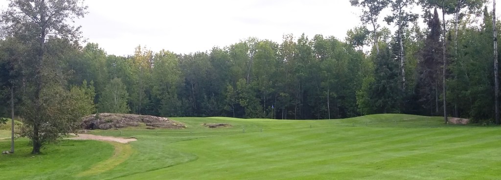 We started on the 18th hole with high hopes for the round. Our tee shot was inside the 100 and we had the below look at our approach shot. The pin was located behind the big rock on the left and was in the middle of the green. Blair hit a fantastic shot over the rock that landed on the front of the green and rolled about 15 feet past the hole. My shot landed on top of the rock, bounced forward and stopped seven feet from the pin on the right. After Rick putted in for birdie, we were off and running!