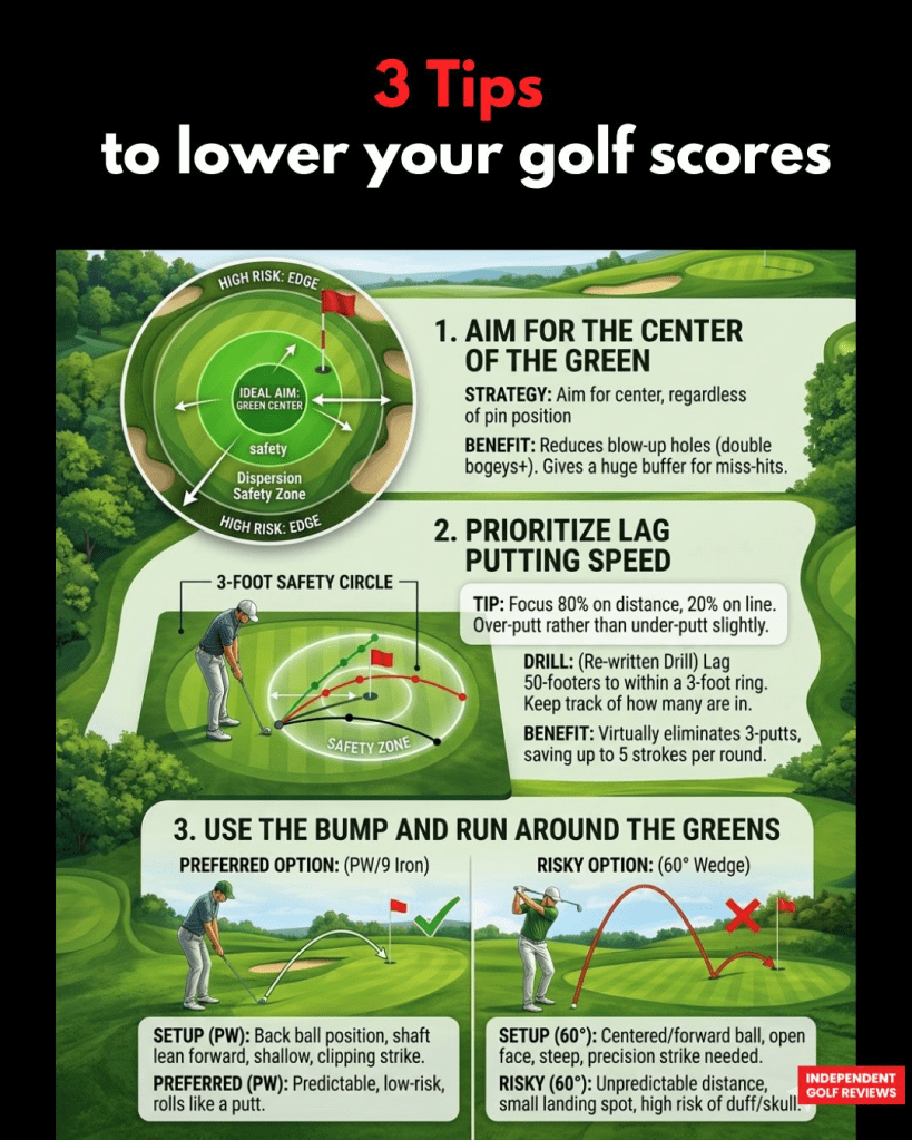 I have talked about all three of these tips in various posts in the past. They are simple and require slight changes to the way you approach your game. The infographic from Independent Golf Reviews FB page and here is how they describe what you need to do to improve your scores.