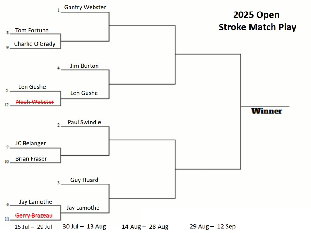 The following is the draw and results of the 2025 Open Stroke Match Play event at Mattawa Golf and Ski Resort. The dates below the draw are when the draw must be completed. Good Luck to all!