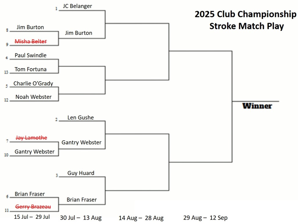 The following is the draw for the 2025 Club Championship at the Mattawa Golf and Ski Resort. Each match must be completed by the date below the draw. Good Luck to all!