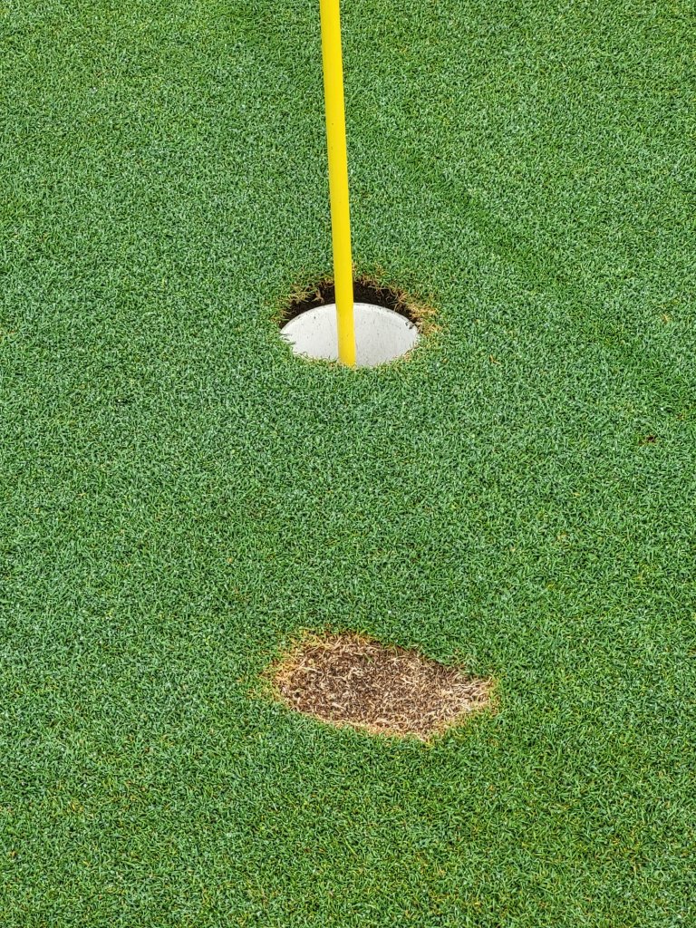As you can see, someone took a gouge out of the green adjacent to the pin! How selfish can a golfer be to damage the green in this manner. Likely, they were frustrated with their shot and swung their club not expecting this result. However, as a long time player who values the efforts of the golf course workers, this type of reaction is unacceptable….period.