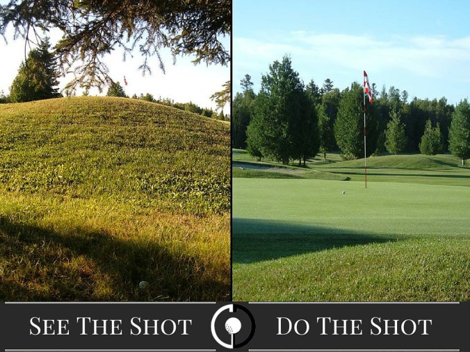 The first is with a sand wedge. I hit the ball just over the top of the hill in the back of my stance so it lands on the green about 5 yards and releases to the pin…..if I hit it cleanly. If I do not, it ends up sort. However, by being aggressive, this is the best shot for getting the ball the closest.