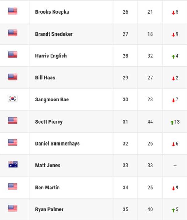 The list below is of the current FedExCup standings of positions between 26 and 35. The first number is the predicted position if nothing chances between now and the end of the tournament. The second number is their current standing  within the FedExCup. And the last number is the movement up or down the standings at the end of the tournament if nothing changes.